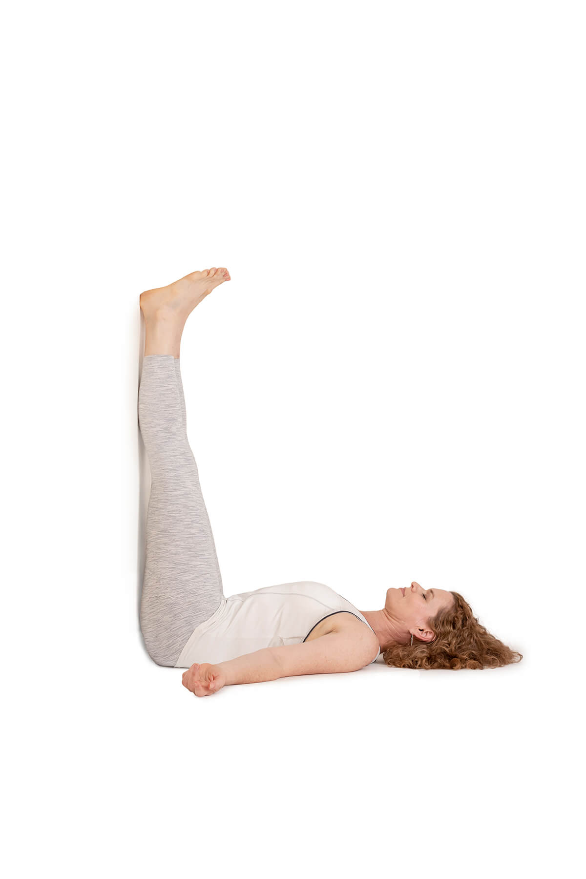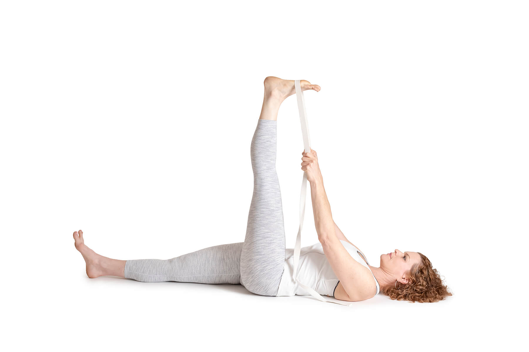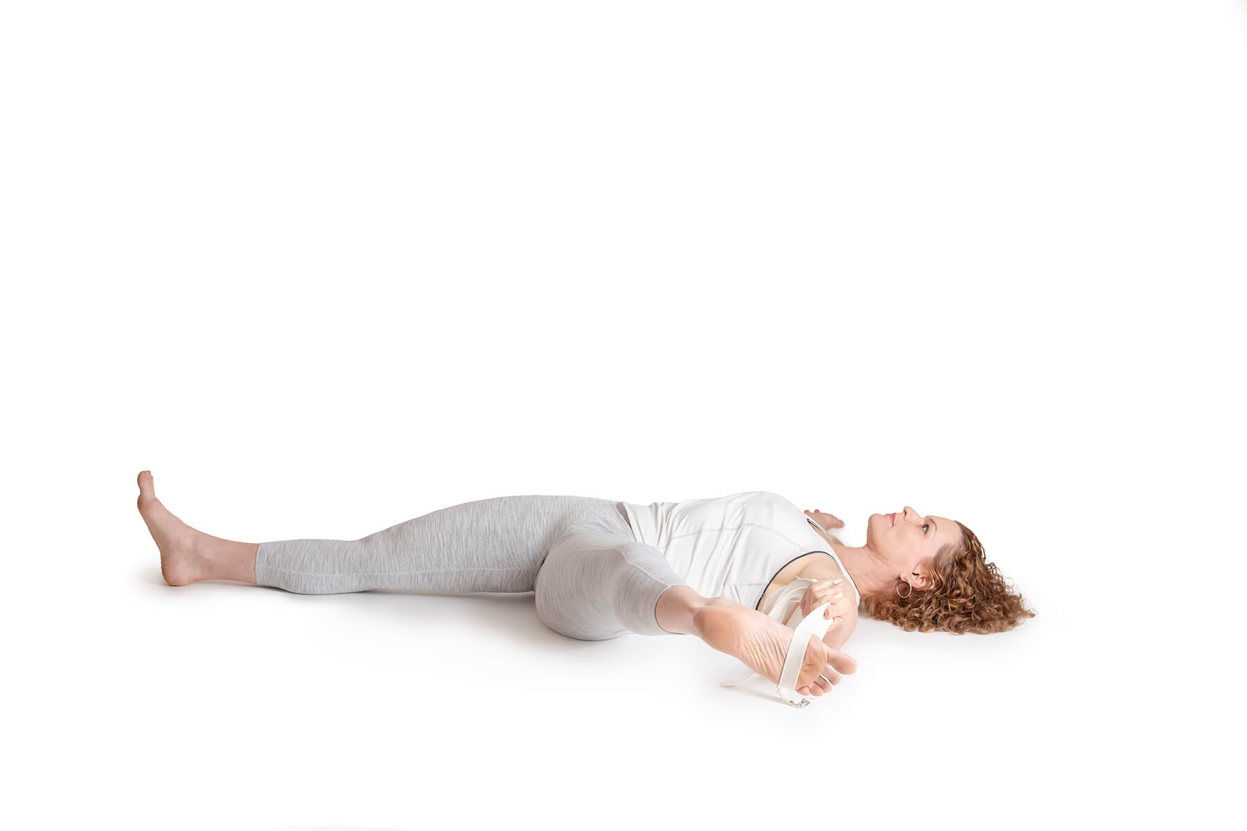 - Straighten your right leg toward the ceiling. If you can’t straighten it easily, use a strap around the arch of your foot and position your leg farther away from you so you can straighten it without strain.