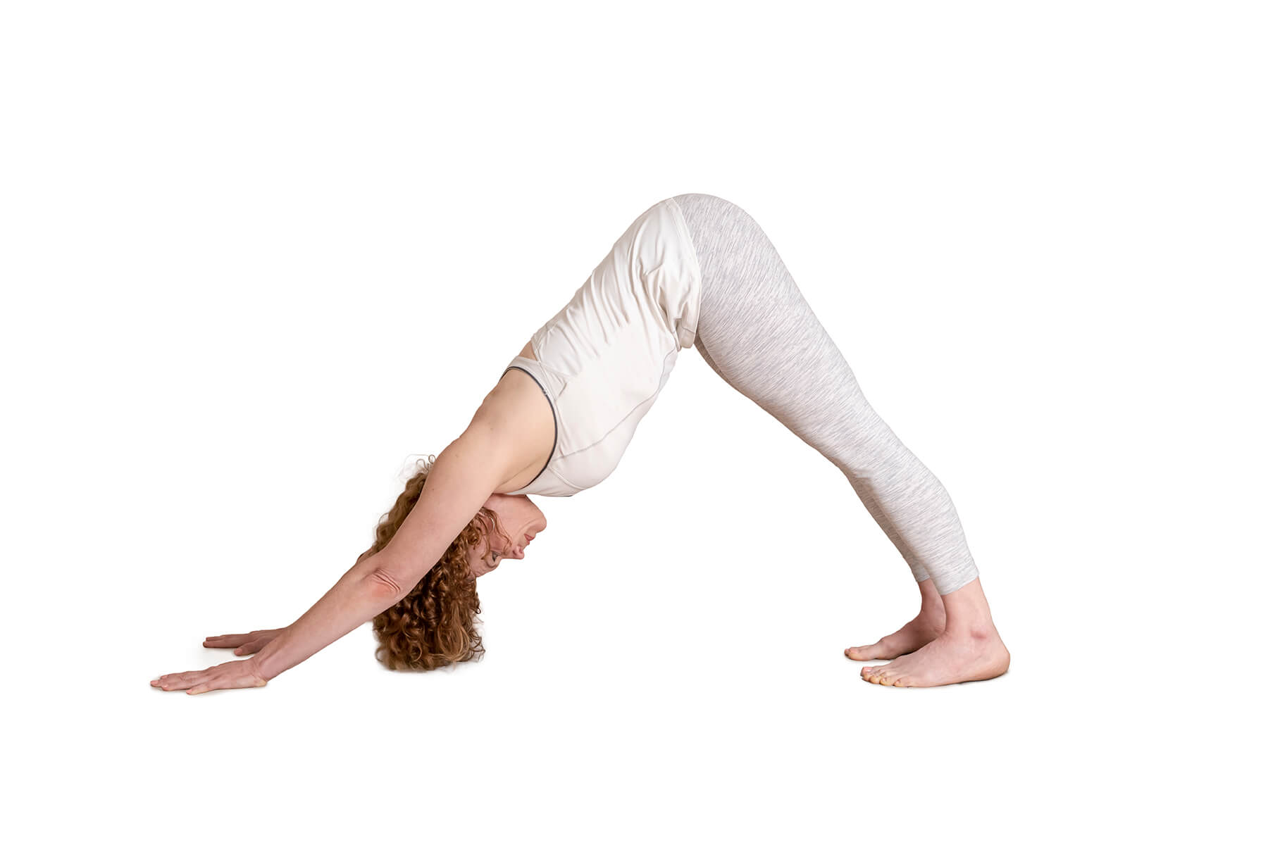 - Press the bases of the index fingers down into the floor and firm the muscles of your arms. Firm your shoulder blades onto your back and stretch your chest away from your hands and toward your legs. Keep your ears in line with your arms.