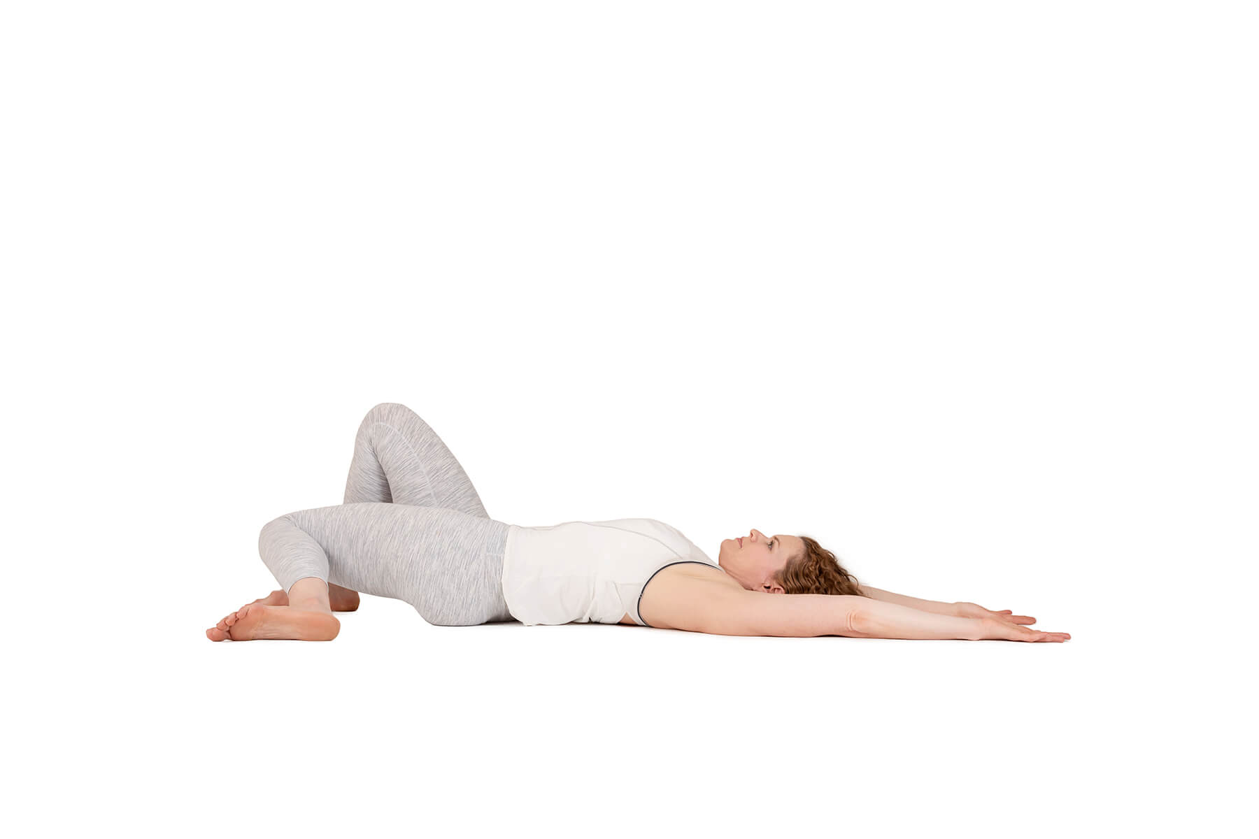 - From sitting, shift over onto your right buttock, swing your legs to the left and place your feet on the floor outside your left hip, with the left ankle resting in the right arch.