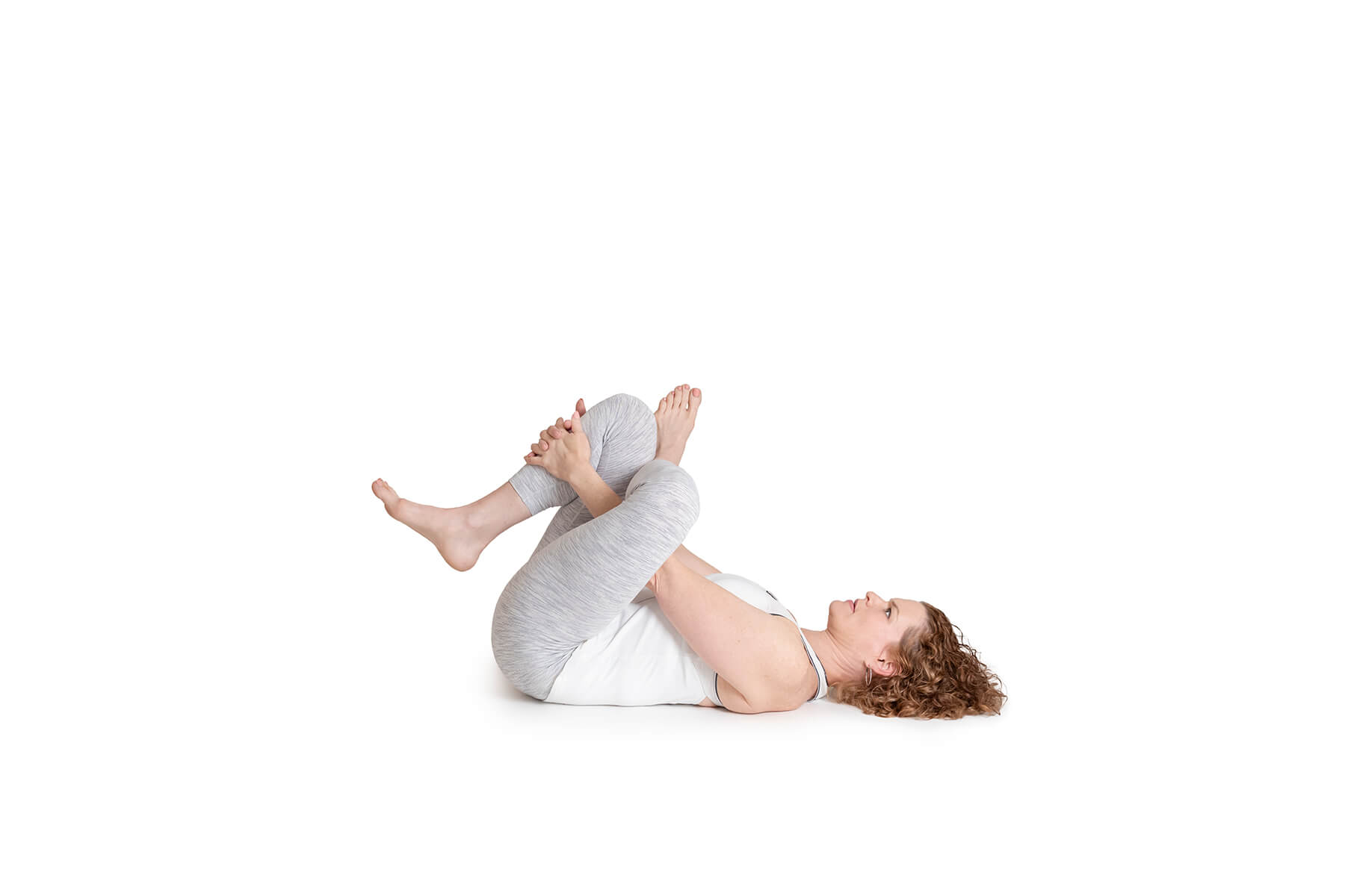 - Draw your right knee in toward your chest. Slide your left hand and forearm through the space between your legs and clasp both hands around the back of your right thigh or the front of your shin.